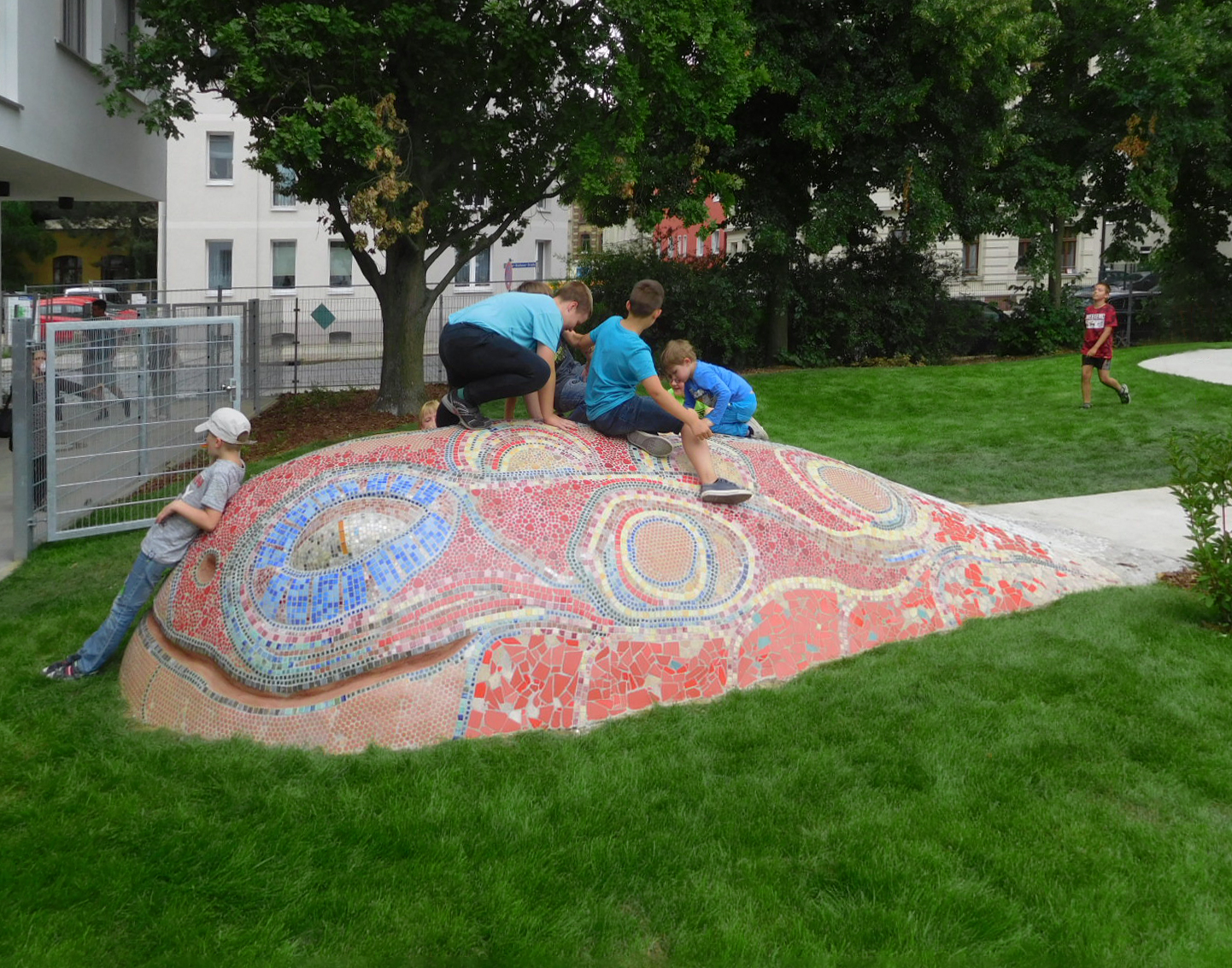 Die Freispielfläche der Ganztagesbetreuung gliedert sich in verschiedene Aufenthaltsbereiche. Sie ist für die Kinder eine Oase im „Großstadtdschungel“. Verbindendes Element ist eine schwungvoll geformte Rollerpiste in Form einer Schlange, die sich durch den ganzen Garten zieht. Daran schließen sich vielfältige Spielangebote an, wie Sandspiel mit „Lagune“, Kletterwand, „Lianenpfad“, „Affenkörbchen“, Bolzplatz und „KingKong-PingPong“. Rückzugsbereiche für ruhiges Spiel oder Chillen sind seitlich eingeordnet.