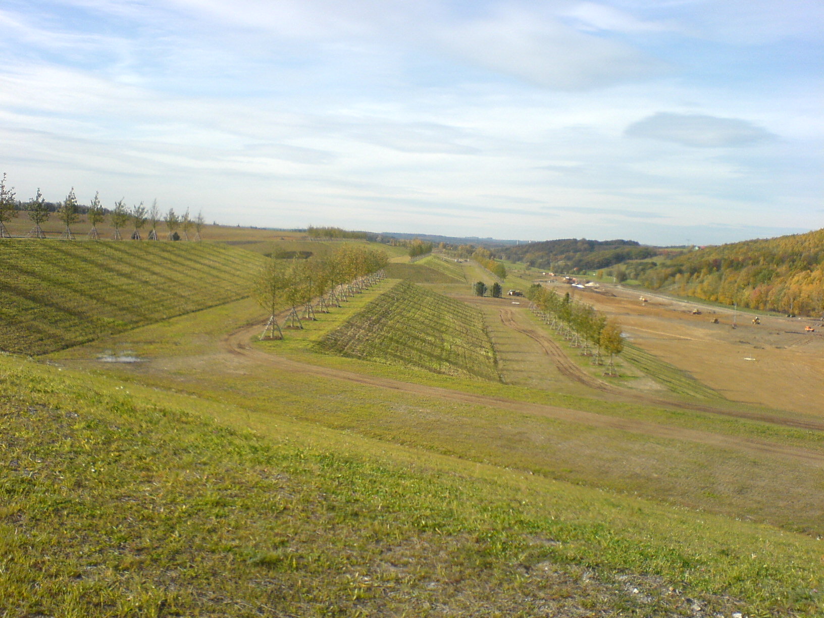Wo 2003 noch Bagger und Planierraupen Gelände formten wurde im darauffolgenden Herbst 2004 die Ansaat der rohen Bodenflächen durchgeführt, unterstützt durch eine Auflage aus Heu.